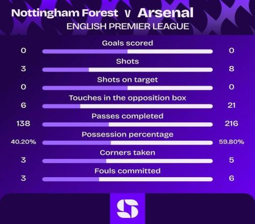 状态不佳,阿森纳对阵森林上半场8脚射门0射正