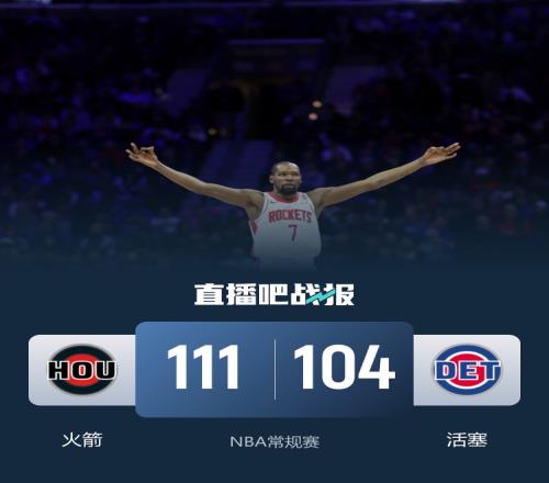 开场后两队打得互有来回,开局两队多次打成平手,火箭不断在内线发起攻势逐渐取得领先,坎宁安通过错位单打为活塞追分,杜兰特首节结束前一记三分帮助火箭扩大优势。第二节上来杜兰特延续手感将场上分差拉大到两位数,随后詹金斯和霍兰联手帮助活塞打出一波13-1的反超比分。申京为火箭止血后,杜兰特再度在进攻端火力全开,不过火箭防守表现不佳无法限制活塞,场上局面再度陷入僵持,半场过后两队打成52平。易边再战,火箭先让申京强攻内线,活塞则是靠着杜伦活跃表现跟火箭继续僵持,杜兰特站出来连中三分帮助火箭掀起攻势,谢泼德替补登场后也是接连拿分,火箭再度取得两位数领先。末节上来再度掀起反扑一度追到只差3分,火箭关键时刻及时稳住局面再度巩固优势,两队拼抢激烈多次发生小摩擦,活塞未能再追上比分,最终火箭111-104终结活塞4连胜。
