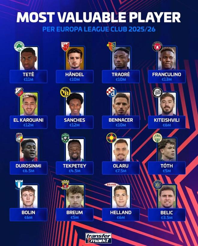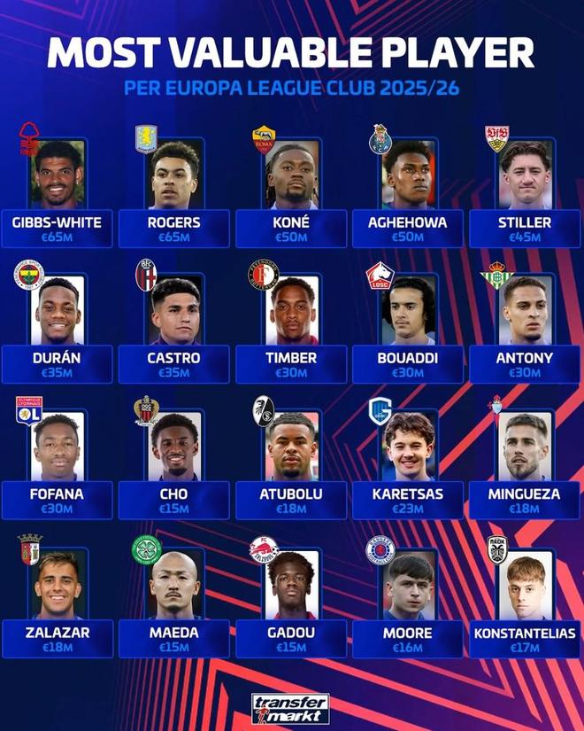 北京时间10月24日,德转列出了本赛季欧联杯36支参赛球队各自身价最高的球员,诺丁汉森林的吉布斯-怀特和阿斯顿维拉的摩根-罗杰斯以6500万欧元并列第一,目前效力于皇家贝蒂斯的安东尼上榜。