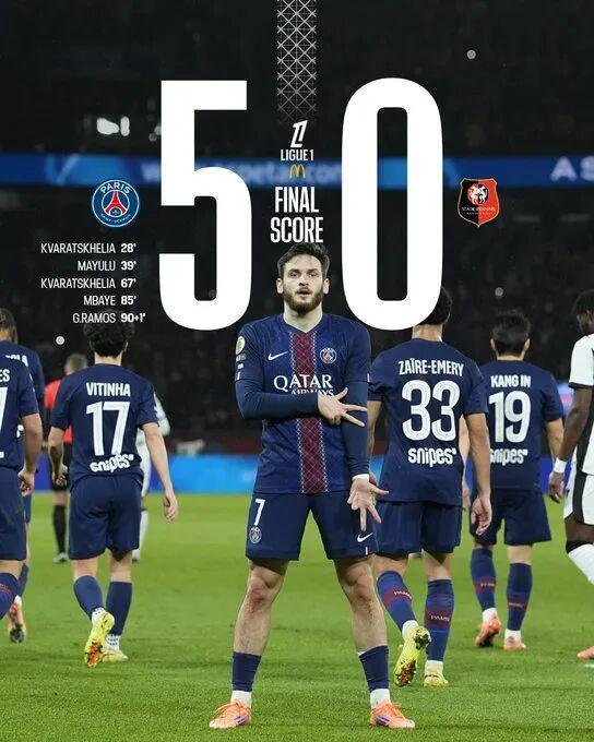北京时间12月7日04:05,法甲联赛第15轮,巴黎圣日耳曼坐镇主场王子公园球场迎战雷恩。上半场,克瓦拉茨赫利亚、马尤卢破门。勒波尔中柱。易边再战,马尤卢中框,克瓦拉茨赫利亚再进一球,雅奎特两黄被罚下,姆巴耶、拉莫斯锦上添花。最终巴黎5-0雷恩。积分榜方面,巴黎33分第二,雷恩24分第六。